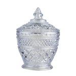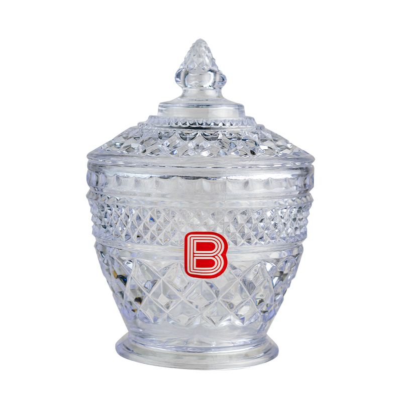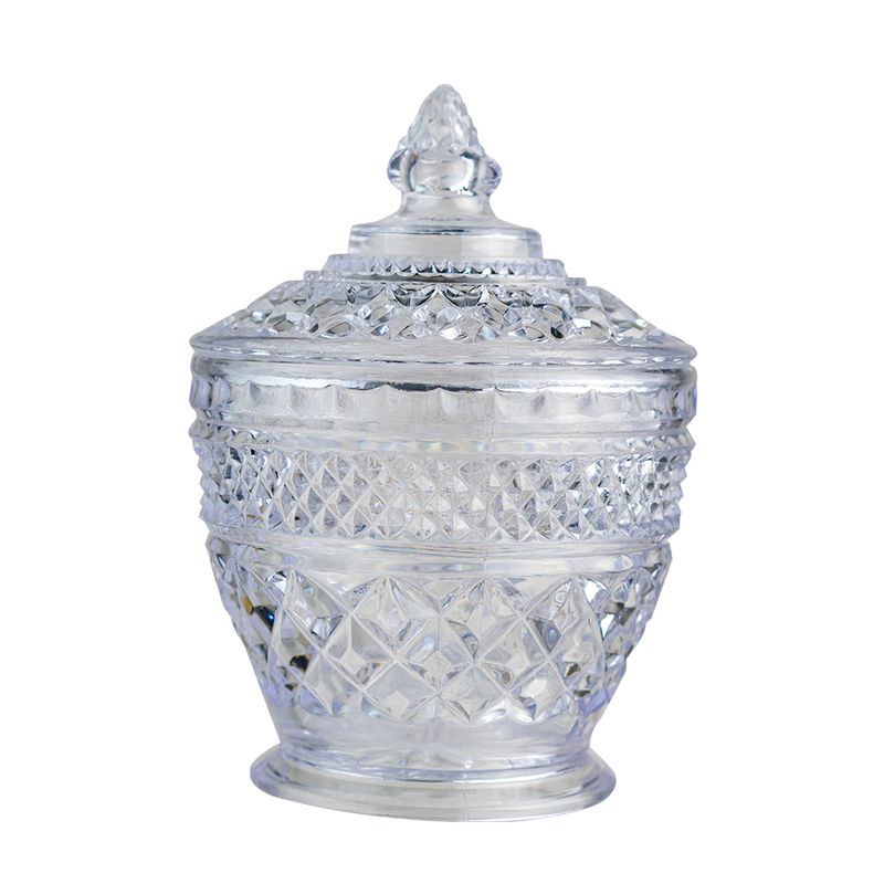 Azucarero transparente con motivos geométricos. Fabricado con materiales aprobados para el contacto con alimentos. No usar en microondas.