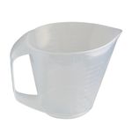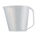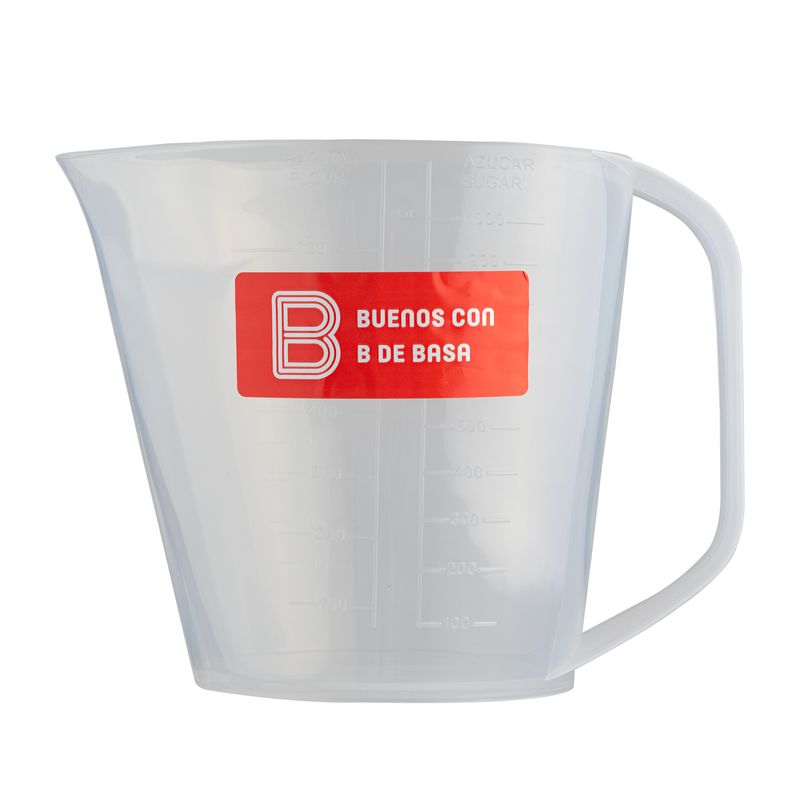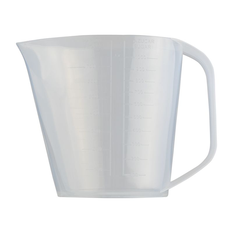 Jarra de 1 litro con cuatro diferentes escalas de graduación en el cuerpo. Fabricado con material apto para el contacto con alimentos y uso en microondas, debido a su transparencia es muy útil en la repostería