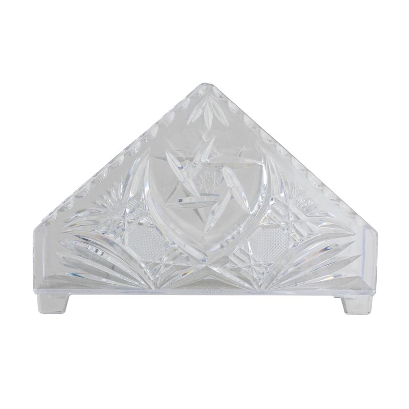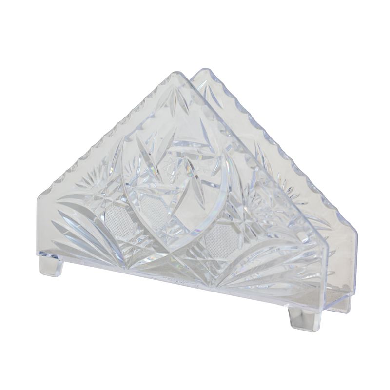 Utensilio trasparente para colocar servilletas. Cuenta con un lindo decorado para dar elegancia a la mesa.